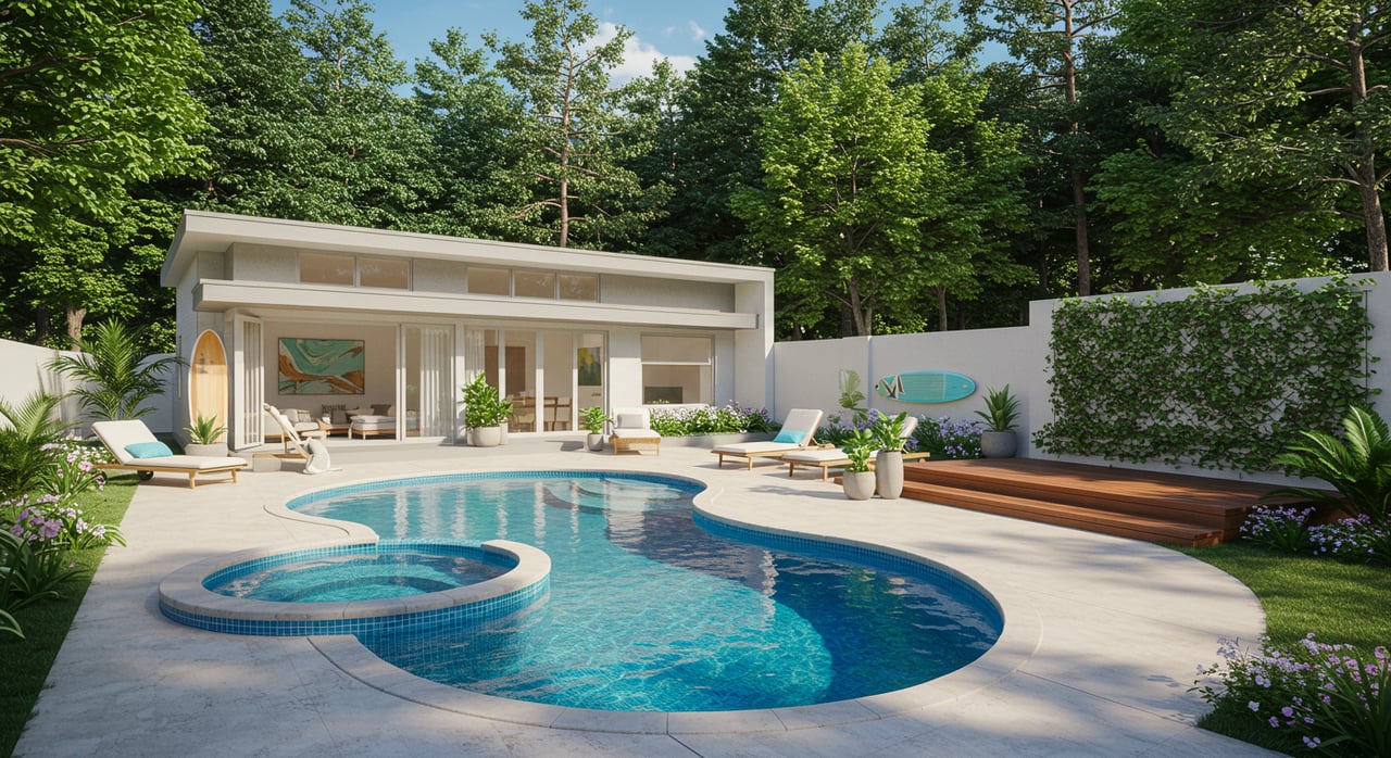 Gorgeous landscaped backyard with pool, low maintenance artificial lawn, banquette deck seating area and built-in gas plumbed fire pit