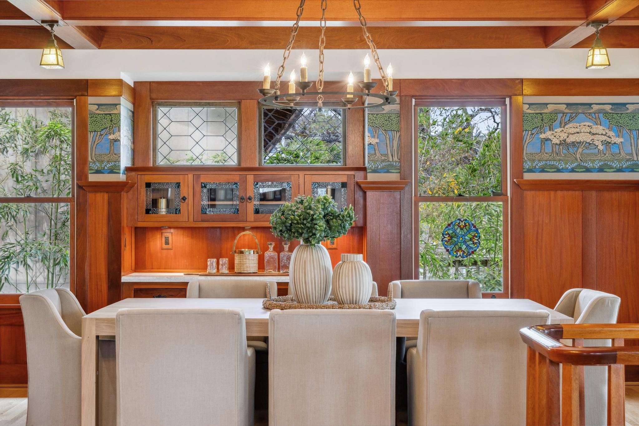 This exquisite home was extensively and meticulously renovated and expanded in 2000/2001, and all the gorgeous Craftsman details, including custom wood box beam ceilings, built-ins, Honduran wood railings, stained glass, and more, were milled onsite, bringing this stunning Craftsman to the showcase quality home you see today.